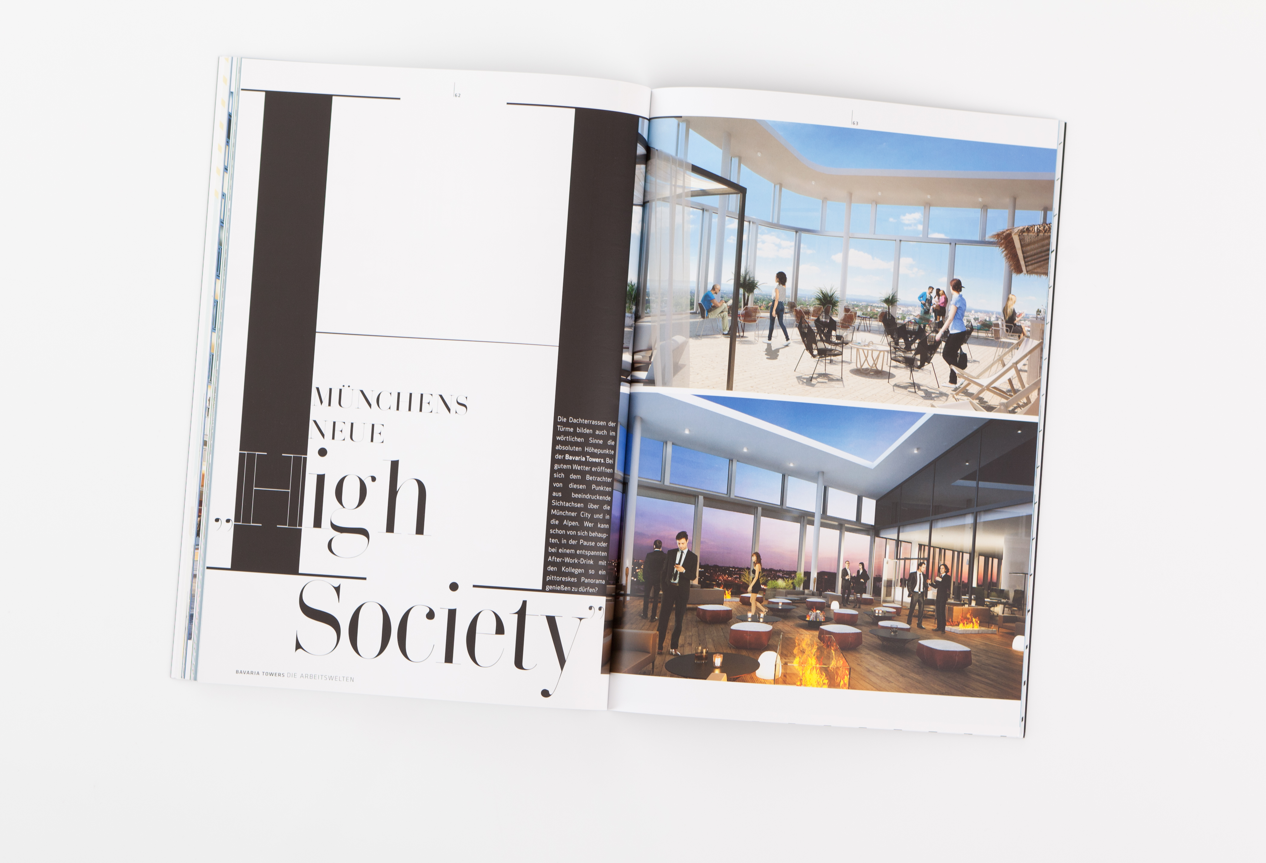 Edle Optik, opulenter Inhalt: Für das Landmark-Projekt Bavaria Towers, das die Skyline von München für immer verändern wird, haben wir ein neues Magazin entwickelt, das die bayerische Magazinwelt für immer verändern wird. Kommt das schwarze Cover noch recht klassisch-hochwertig daher, zeigen wir im Inhalt die ganze Bandbreite unserer Designkunst. Und natürlich alle Facetten des Ensembles, von der Ausstattung bis zur Dachterrasse, vom Style-Konzept bis zur Lobby-Gestaltung.
