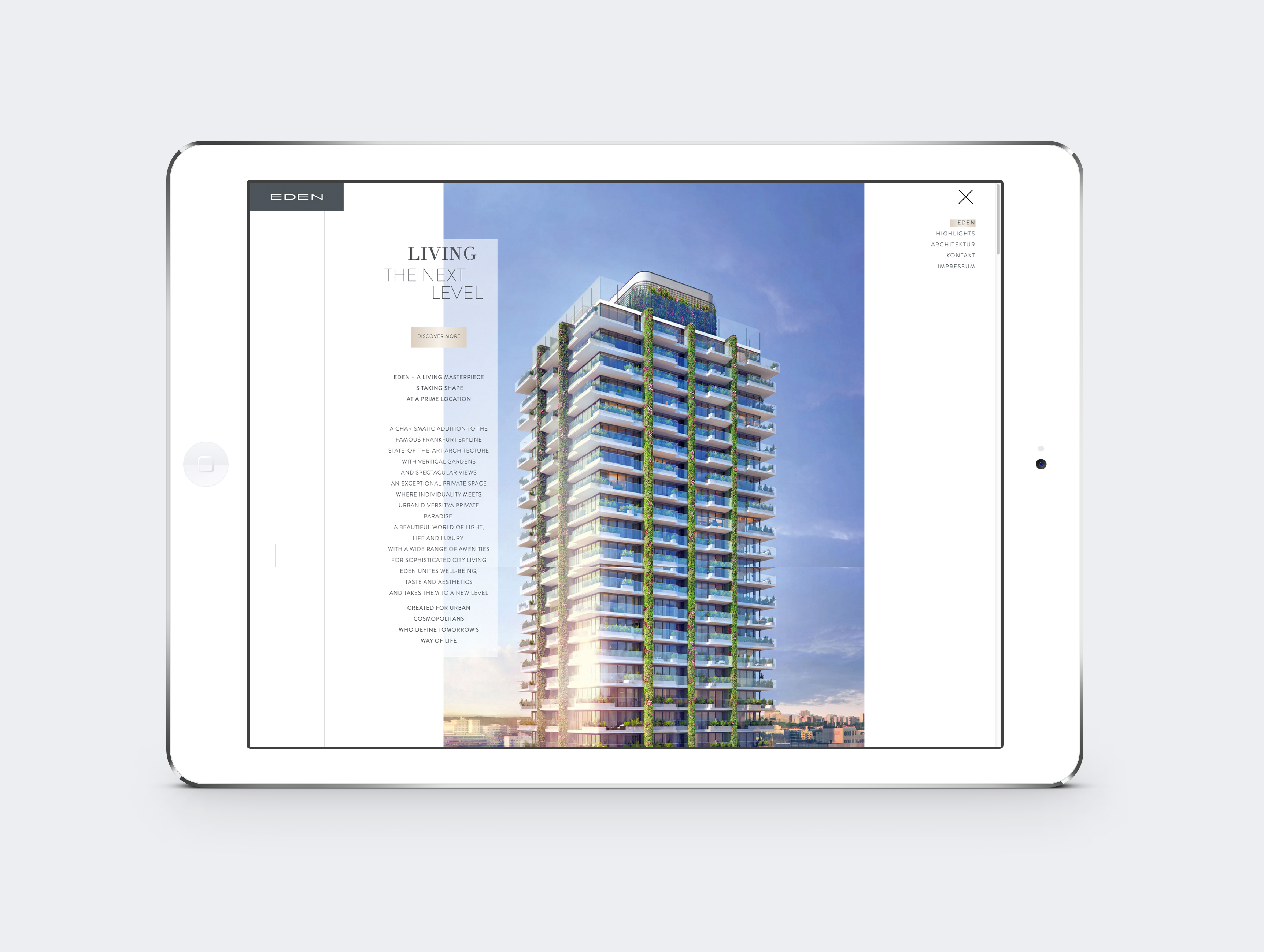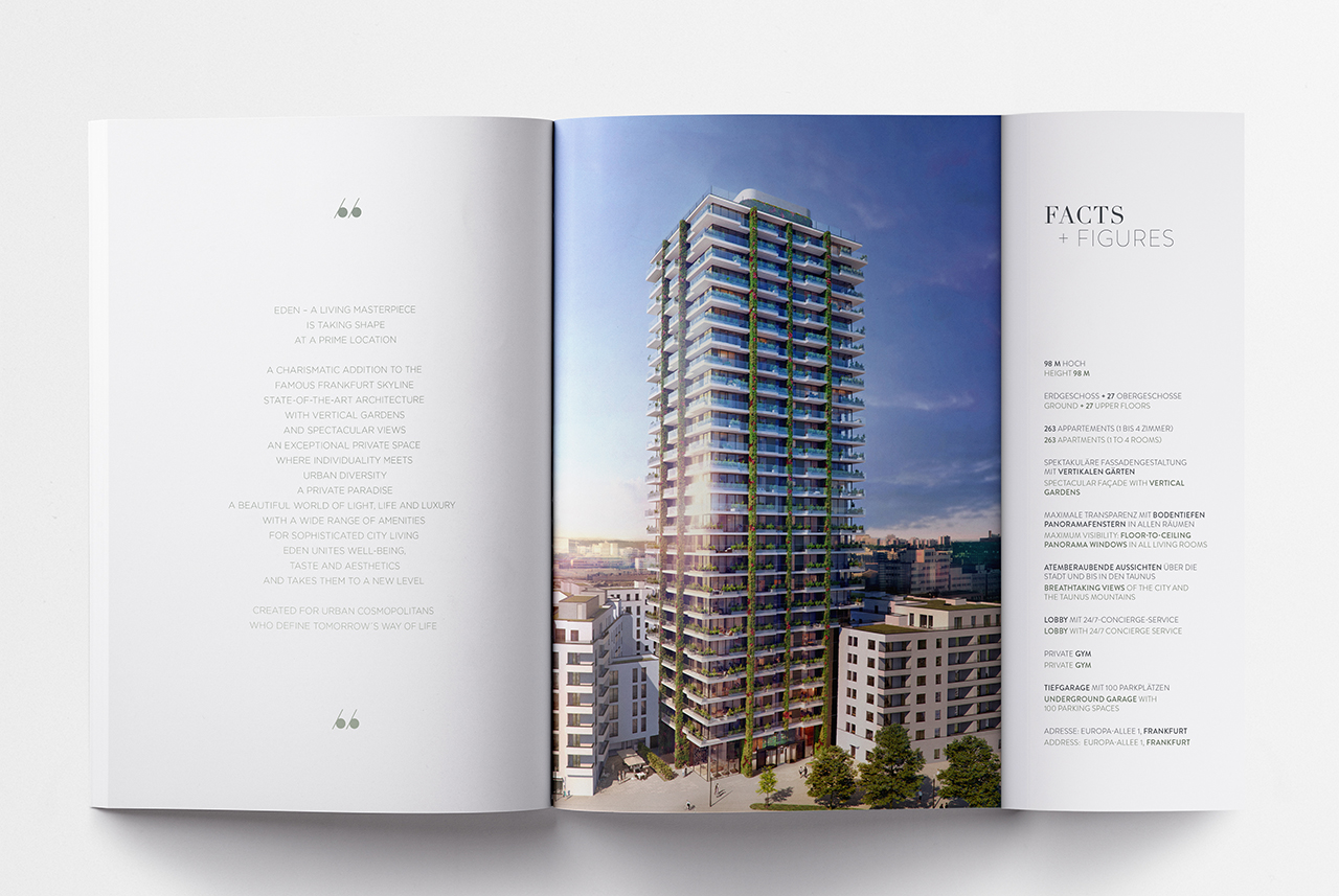 Spannende Architektur, kristalline Transparenz und florale Elemente formen das unverwechselbare Erscheinungsbild des ersten Projekts von Immobel in Frankfurt am Main und damit in Deutschland überhaupt. Die vertikalen Gärten verbinden sich mit der filigranen Glasfassade zu einem lebendigen Gesamtkunstwerk: EDEN. Direkt am Knotenpunkt von drei pulsierenden Frankfurter Stadtvierteln (Westend, Gallus- und Bahnhofsviertel) werden hier 27 Obergeschosse mit 263 1- bis 4-Zimmer Appartments entstehen. Der Vermarktungs-Relaunch im Juni 2019 war sehr erfolgreich, wir freuen uns mit unserem neuen Kunden Immobel über den sich abzeichnenden Erfolg dieses richtungsweisenden Hochhausprojekts mitten in der Metropole Frankfurt am Main.