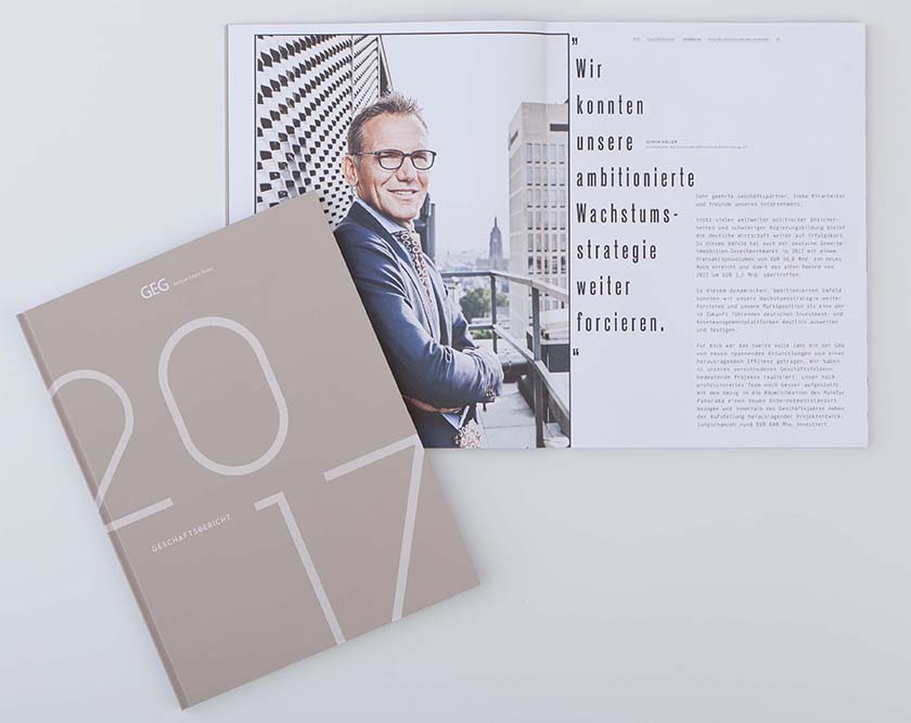 Mit dem Geschäftsbericht 2017 für die German Estate Group hat STERN neue Maßstäbe gesetzt – und mit dem Iconic Award 2018 einen der begehrtesten Awards der Real-Estate-Branche gewonnen. Der Report über die Aktivitäten des Unternehmens kombiniert Elemente klassischer Geschäftsberichte mit Merkmalen moderner Magazine zu einem einzigartigen Statement im Bereich Unternehmenskommunikation. STERN zeigt auch in diesem Jahr vorbildlich auf, wie sich die Fülle der für den Bericht geforderten Informationen zielgruppengerecht und mit einem hohen Anspruch an klares, aufgeräumtes und doch detailverliebtes und überraschendes Design darstellen lässt. Führende Mitarbeiter der GEG kommen ebenfalls zu Wort und geben dem Geschäftsbericht ein sympathisches Gesicht.