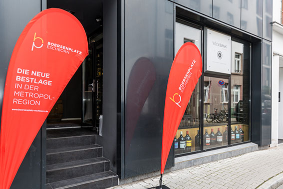 Beim Brainstorming für ein neues Businessquartier in Eschborn orientierten wir uns am Local Hero des Standortes: Die Konzernzentrale der Deutschen Börse mit der ambitionierten Architektur ist das prominenteste Unternehmen der Stadt. Eschborn ist durch seinen Branchenmix zu einem bedeutenden Finanzplatz in Deutschland avanciert und verdient einen eigenen Börsenplatz. Wo sollte dieser sein, wenn nicht direkt gegenüber der Börse selbst?