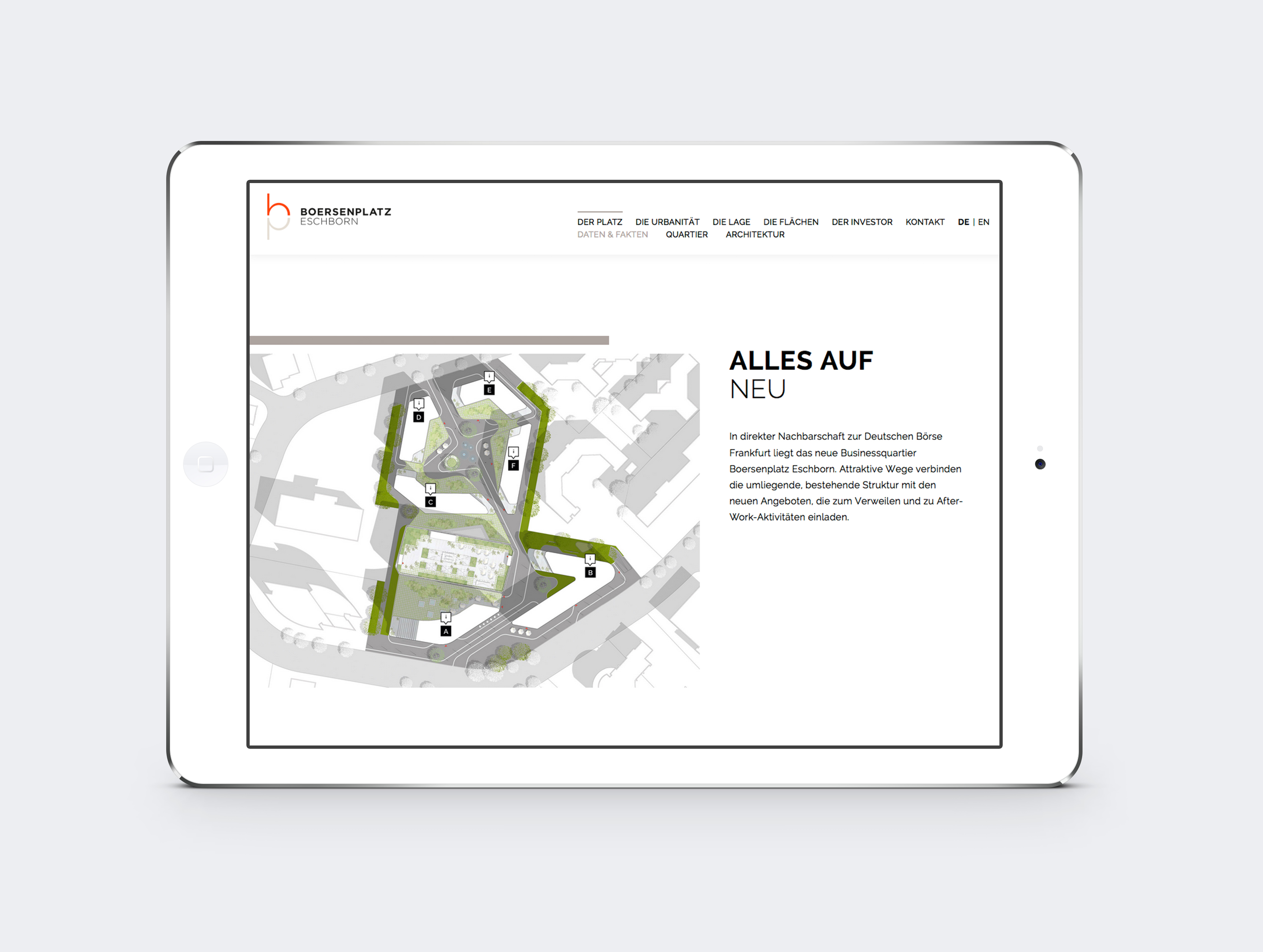 Das Projekt unseres Kunden Gertler Estates sieht einen zentralen Platz mit der entsprechenden „Platzqualität“ vor: Architektur, Wegeführung, Besatz mit Gastronomie und Services, viele Grün- und Wasserflächen. Die Bezeichnung Börsenplatz verleiht der Planung Bedeutung und Vision. Aus einem einfachen Namen wird ein adressbildendes und selbsterklärendes Schlüsselelement der Kommunikation.