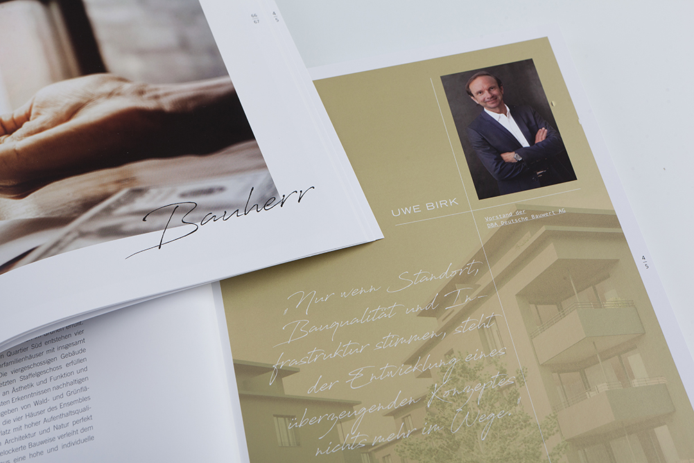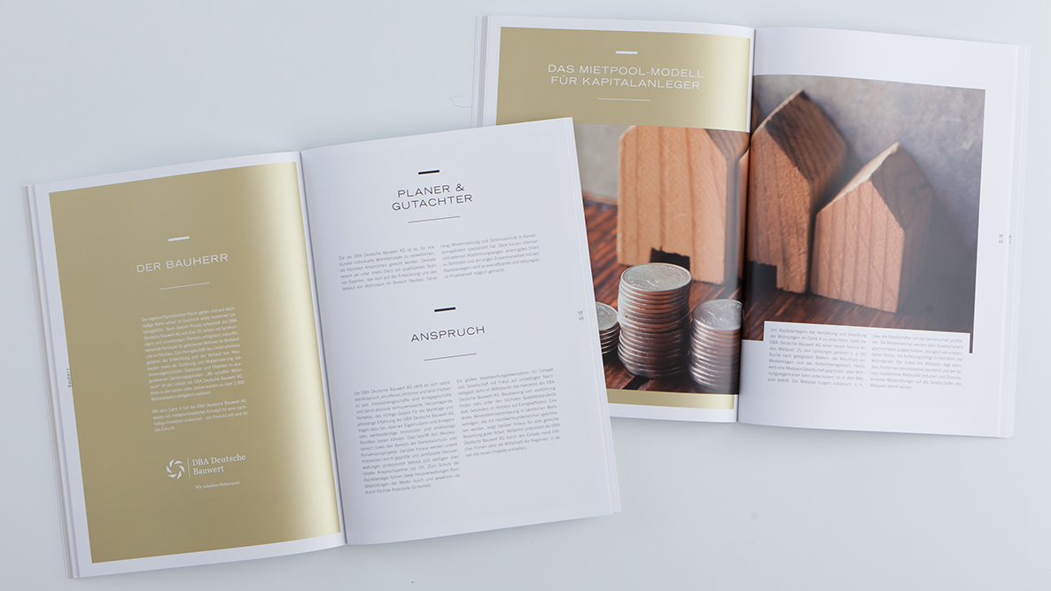 Mit dem Neubauprojekt Carré 4 wird die Erfolgsgeschichte der DBA Deutsche Bauwert AG in Montabaur fortgesetzt. Im Carré 4 im Quartier Süd entstehen vier außergewöhnliche Mehrfamilienhäuser mit insgesamt 102 Wohneinheiten. STERN realisierte dafür zwei hochwertige Exposés: In der Imagebroschüre werden allgemeine Informationen im Rahmen eines schönen Layouts vorgestellt, die technische Broschüre beinhaltet raffiniert aufbereitete Grundrisse und Lagepläne. Die modernen Ansprüche der DBA Deutsche Bauwert an Ästhetik und Funktion werden mit den beiden Exposés und der ergänzenden Website perfekt aufgegriffen und in Szene gesetzt.