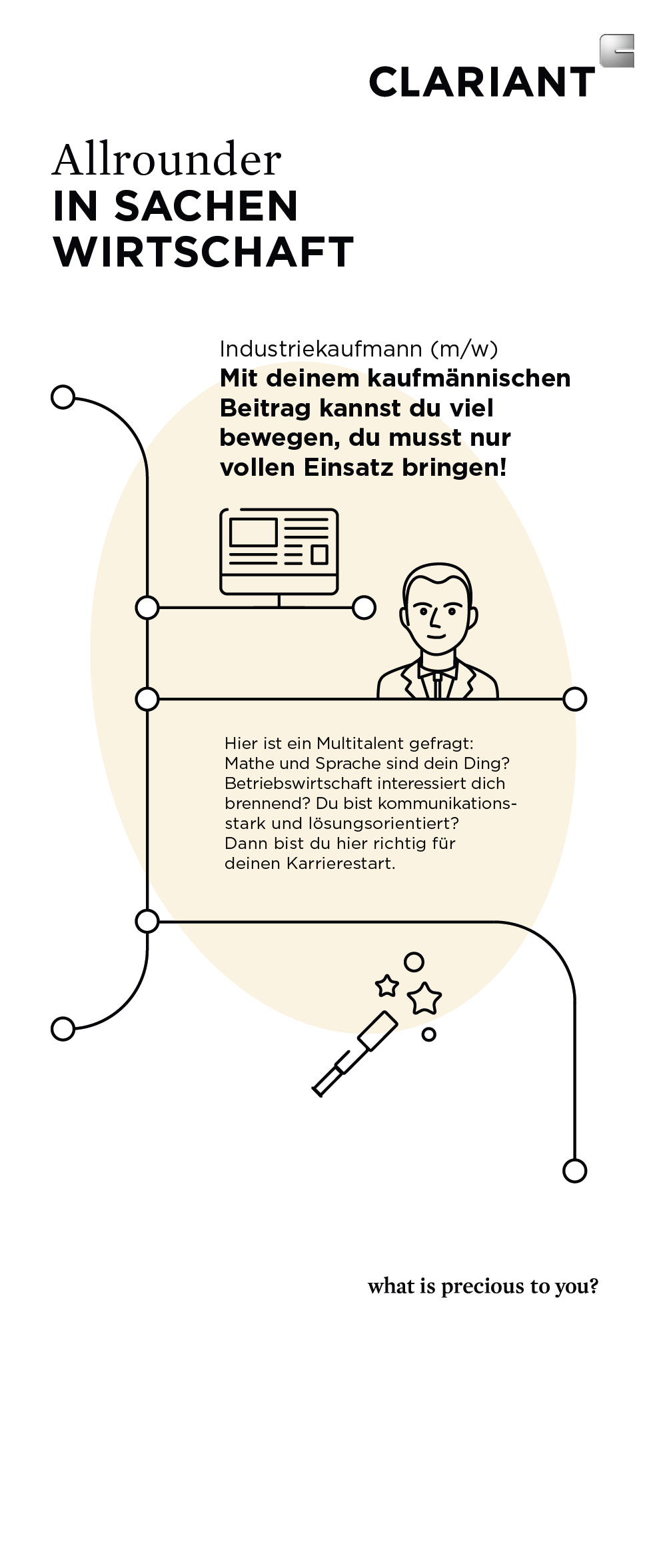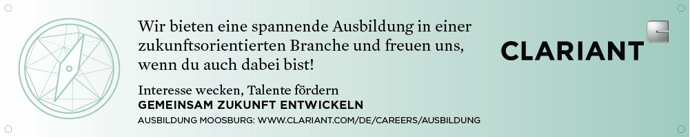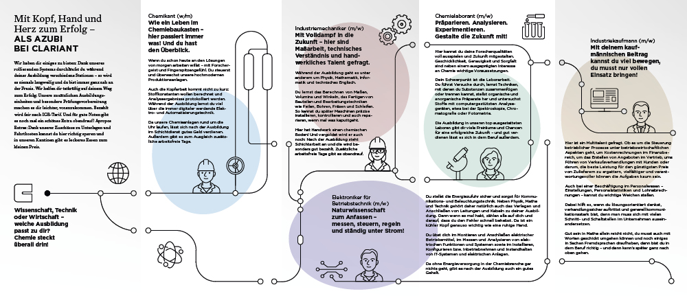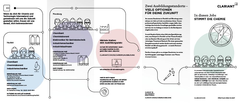 Gute Auszubildende zu finden, ist auch für unseren Spezialchemie-Kunden Clariant eine wichtige Investition in die Zukunft. Unter dem Motto "Interesse wecken, Talente fördern – gemeinsam Zukunft entwickeln" haben wir ein schönes Promotion-Paket geschnürt: Eine großformatige Präsentationswand für Ausbildungsmessen, ein informativer Leporello mit Ausbildungsprofilen, knackige E-Mail-Footer, Banner und T-Shirts für Messebetreuer und Ausbilder helfen Clariant dabei, sich als spannender Arbeitgeber zu präsentieren, der jungen Menschen echte Perspektiven bietet. Die moderne, klare Gestaltung spricht dabei die potenziellen Azubis ebenso an wie die trendigen Texte.
