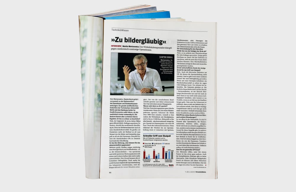 Bandscheibenvorfälle, Arthrose – Erkrankungen am Rücken gehören zu den größten Volkskrankheiten Deutschlands. Entsprechend groß ist das Aufklärungsbedürfnis innerhalb der Bevölkerung. Für unseren Kunden – den Münchner Orthopäden und Schmerztherapeuten Dr. Martin Marianowicz – leisten wir seit vielen Jahren genau diese Aufklärungsarbeit. Und haben den Gesundheitsmarkt verändert. Wer hat vor einigen Jahren schon gewusst, dass 80 Prozent aller Rückenoperationen überflüssig sind? Dank strategischer Pressearbeit gehört die kritische Betrachtung operativer Eingriffe heute in Deutschland zum Common Sense. Und aus dem Münchner Orthopäden wurde nach und nach Deutschlands Rückenexperte No. 1. Titelseiten in BILD, Präsenz in den führenden Wirtschaftsmedien Deutschlands, Talkshow-Auftritte bei Maischberger & Co. – heute ist unser ebenso charismatischer wie schonungslos offener Kunde in aller Munde. Er ist Bestseller-Autor, hat mit Barbara Becker eine Rücken-DVD auf den Markt gebracht und in München sowie am Tegernsee führende Medizin-Zentren aufgebaut, die mit ihren innovativen Behand- lungsmethoden weltweit Furore machen.