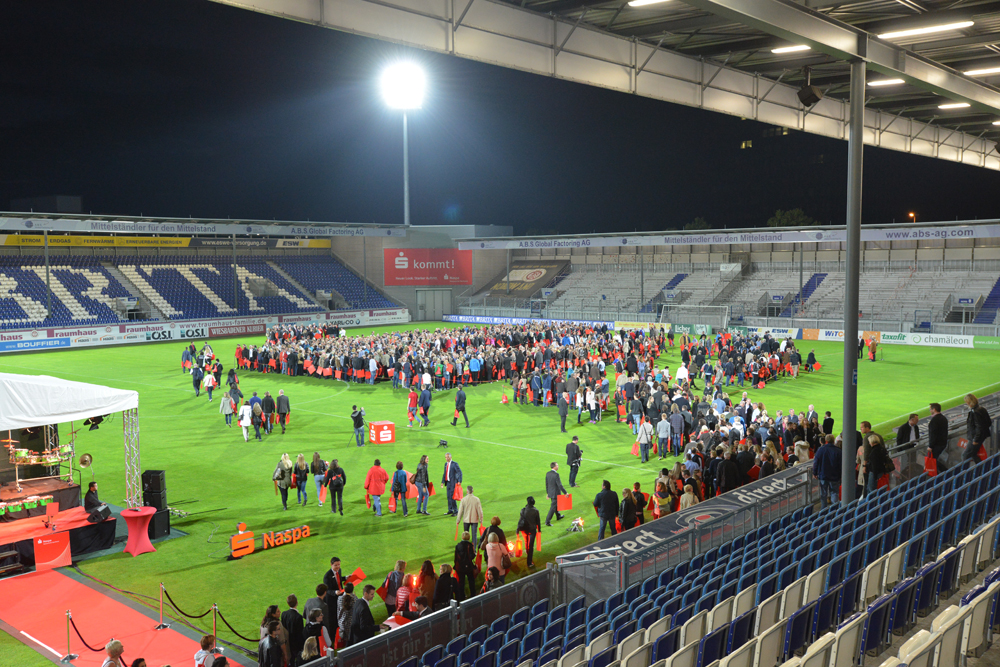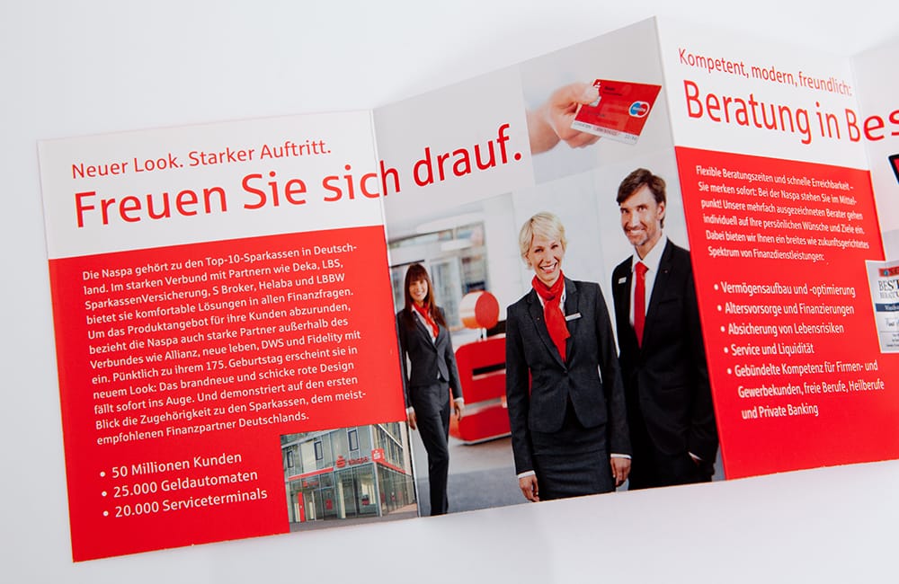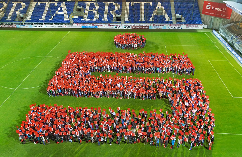 Kommunikation ist unsere Leidenschaft. Und das nicht nur im Bereich Immobilien. Wie sag’ ich’s meinen Kunden? Und wie meinen Mitarbeitern? Circa 140 Filialen der Nassauischen Sparkasse werden von Blau-Orange auf Sparkassen-Rot umgestellt: Weit mehr als eine logistische Herausforderung. STERN schneidert der Naspa die 360-Grad-Kampagne S kommt! für alle Zielgruppen auf den Leib. Mit Außenwerbung, Verkehrsmittelwerbung, POS-Aktionen, PR und Events in allen Filialen. Eine spektakuläre Veranstaltung in der Brita Arena in Wiesbaden stimmt die Naspa-Mitarbeiter auf die Umstellung ein. Der emotionale Höhepunkt: 1.500 Menschen formieren sich zum riesigen roten Sparkassen-S auf dem Rasen des Stadions. Ein unvergesslicher Moment für alle Beteiligten.