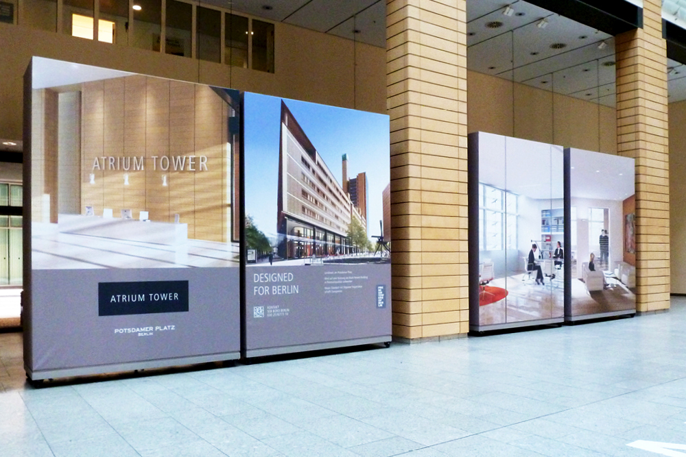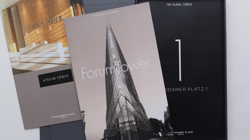 Da sein, wo Geschichte geschrieben wird: Erst das Objektmarketing für den Atrium Tower, dann der Potsdamer Platz 1, gefolgt vom Forum Tower. Schließlich der Auftrag für die Entwicklung eines Gestaltungsrahmens für die Kommunikation des gesamten Potsdamer Platzes und die konsequente Umsetzung der Maßnahmen. Office, Shopping, Entertainment und Wohnen. Nicht nur für uns, sondern für jede anspruchsvolle Kommunikations-Agentur eine einmalige Herausforderung. Eines der ersten Ergebnisse war das modulare Leitbild “A place for ...”, mit dem die Highlights der jeweiligen Kommunikationsmaßnahmen betont werden.