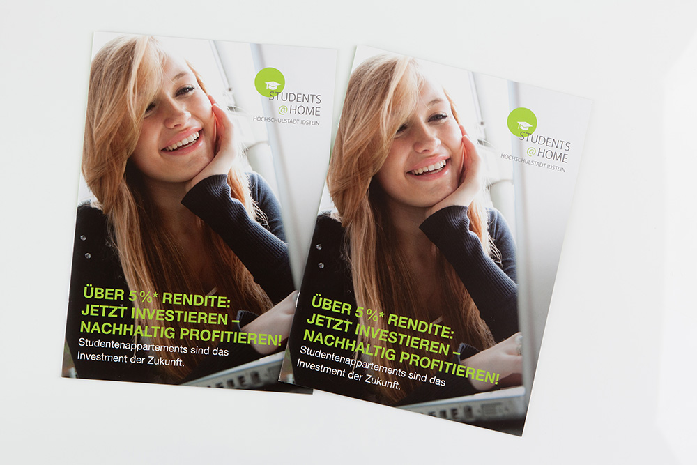 Mikroappartements sind eine attraktive und langfristige Kapitalanlage für Investoren. students@home Idstein ist eine moderne Wohnanlage mit 205 komplett möblierten Mikroappartements, in denen sich Leben und Lernen für Studenten in einer neuen, sympathischen Qualität gestalten lässt. Studentisches Wohnen zeichnet sich durch Modernität und ein junges, frisches Design aus. Damit war auch der Anspruch an den Auftritt des Projekts definiert: Broschüren, Flyer, Mailings, Anzeigen, Banner, Aufkleber und Plakate greifen das studentische Flair auf und sprechen die Zielgruppe optimal an.