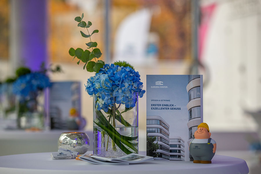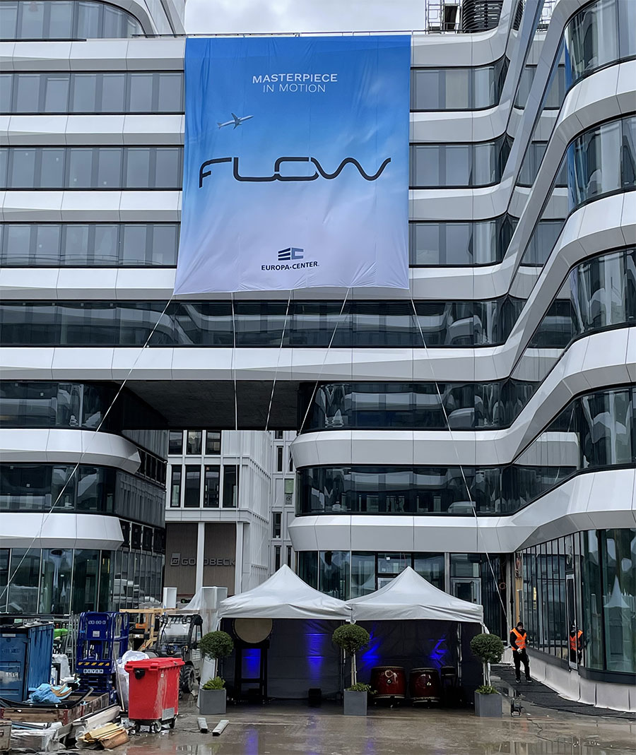 Kommunikation wie wir sie lieben: Ein 360°-Projekt mit Kick-off-Event, Corporate Design, Marketing-Tools, PR-Begleitung und Social Media haben wir jetzt für unseren Kunden EUROPA-CENTER in Gateway Gardens am Flughafen Frankfurt umgesetzt. Der Entwickler und Bestandshalter von Gewerbeimmobilien aus Hamburg gewährte dort Partnern, Vertretern der Immobilienbranche und der anwesenden Presse exklusive Einblicke in den neuen Businesscampus, der kurz vor seiner Fertigstellung in 2022 steht und stellte gleichzeitig die neuen Musterbüros vor. Wir haben die 2G-Veranstaltung für rund 100 Gäste als spannungs- und stimmungsvollen Event inszeniert. Highlight war die Verkündung des neuen Projektnamens Flow, der unter Trommelwirbel auf einem 120 qm großen Banner an der namensprägenden Fassade herabgelassen wurde. Der Name Flow steht für die harmonische Ästhetik der Architektur, die Mobilität am Drehkreuz Europas und die Balance zwischen Leben und Arbeiten, die der zukunftsweisende Standort am Airport bietet.